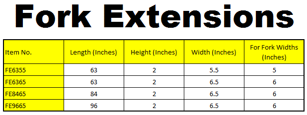 Forklift fork extensions are designed to be used when long objects or large pallets must be lifted or moved with a forklift truck. Extensions must NOT exceed the length of forks on which they are to be installed by more than 50%. Each pair of extensions is of welded steel construction and include a steel retaining strap to prevent slippage during use. Powder coated orange finish.
