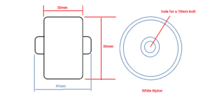 These rollers are made from Nylon and have a diameter of 50mm, width of wheel 30mm and width of centre 41mm.